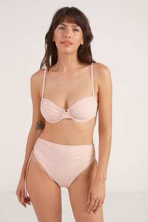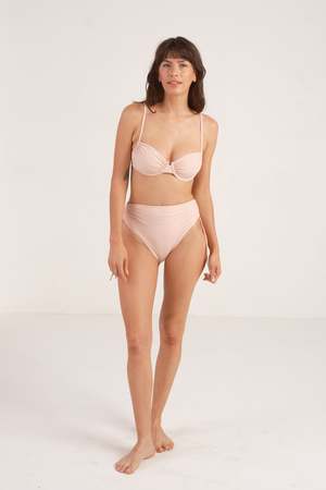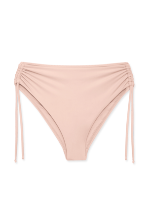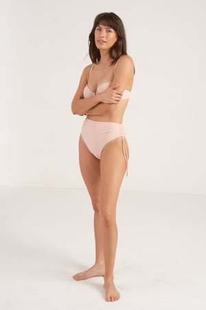 This romantic, high-waisted bottom has adjustable ties at the side seam for a leg as high as you dare or as low as you like. It features a clean-finished, no-pinch waist, moderate coverage, and supportive double-faced construction. - Studio model measurements: 5'7" / 32B/C / 25" /36" - Models wears a size Small. - Made in Los Angeles of Italian fabric. - 88% recycled Econyl / 22% Spandex