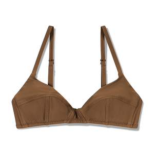 An updated take on a vintage shape. This soft-structured top features contour seaming and a light-as-air layer of foam along the bottom bust. Adjustable shoulder straps and a rubberized g-hook closure with 3-loop adjustment for the most perfect fit. Shown here with the Slim Line and High Kick Brief. It also pairs well with the High Bottom or the Band Brief. - Braina is wearing a size small. - Made in Los Angeles of Italian fabric. - 88% recycled Econyl / 22% Spandex - Learn more about swim care for a suit that lasts.