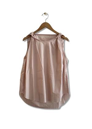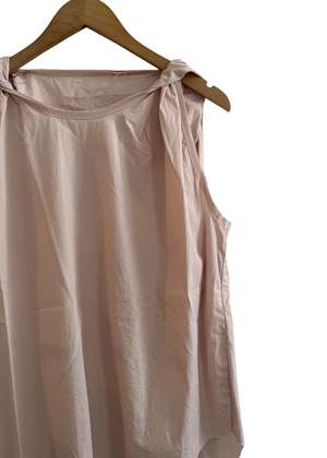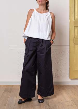 The Twisted Top by Gallego Desportes is crafted from crisp cotton poplin with a raw cut for lightness. It features a crew neckline with twisted shoulder seams, a slight A-line silhouette, and a rounded hem. Fits true to size. 100% cotton. Made in France.