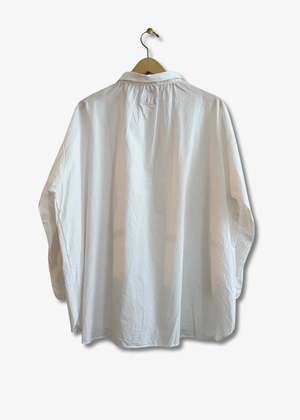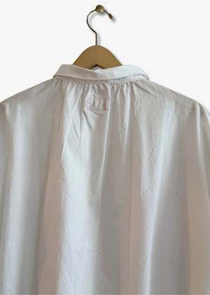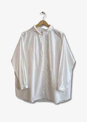 The Antik Shirt by Gallego Desportes is crafted from crisp cotton poplin and offers an oversized white top perfect for any wardrobe. It features a button front with a wave collar, classic French cuffs, three pleats under the collar that create a fuller silhouette, and drop shoulders. 100% cotton poplin Machine wash cold, hang to dry Made in France.