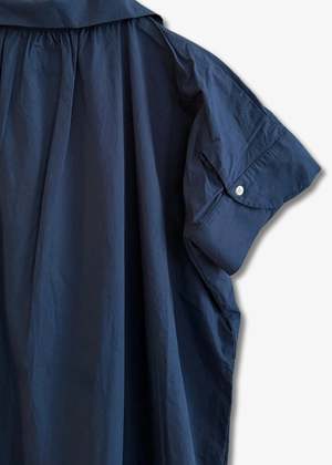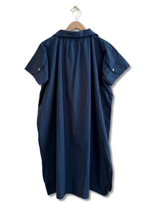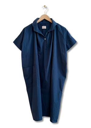 This shirt dress is crafted from crisp cotton poplin and features a wave collar with three pleats underneath to create a fuller silhouette. It has a front button placket, button openings at the back of the sleeve cuffs, one large front patch pocket on the lower right, and side slits at the bottom hemline. Fits true to size. 100% cotton. Machine wash cold, hang to dry. Made in France.