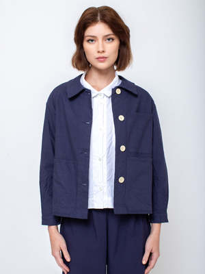 Button-front work jacket in cotton canvas. Features a rounded collar, generous arm, back box pleat, and unlined construction. Made in France. 100% Cotton Canvas. Hand wash or dry clean.