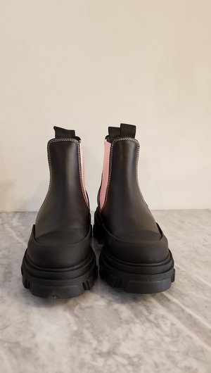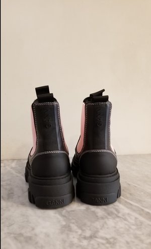 Signature GANNI low leather chelsea boots with super chunky, ribbed rubber soles, elasticated and toe caps. 100% CALF LEATHER, light pink stretch