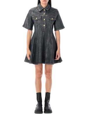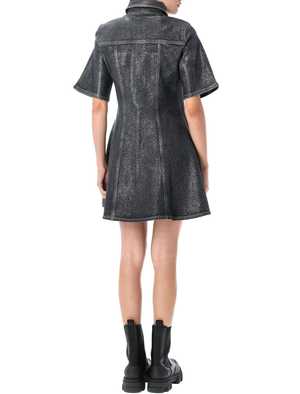 Women > Clothing > Dresses Organic Cotton Shimmery Foil Denim Mini Dress by Ganni. Featuring: point collar, front button closure, short sleeves, chest flap buttoned pockets, engraved logo2 gold-tone buttons, fitted waist, and flared skirt. Model is 1.70 m and wears size 36. Composition: 99% organic cotton, 1% elastane.