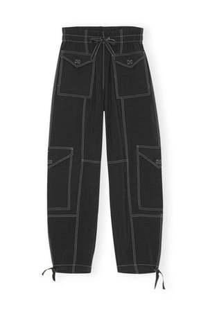 Ganni light slub high waisted cargo pocket pants in black with white stitching. Elastic waist, relaxed fit, drawstring closures and ankle ties. 88% viscose, 12% recycled polyester. Made in Turkey F7161 PIPE AND ROW