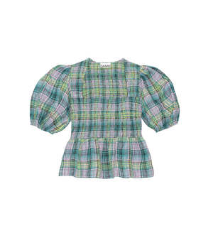 The Seersucker Check Smock Blouse in Lagoon by Ganni is a feminine, square neck top featuring puff sleeves with elastic edge and a smocked bodice with peplum silhouette. - 60% Certified Organic Cotton, 36% Certified Recycled Polyester, 4% Polyamide - Made in Turkey