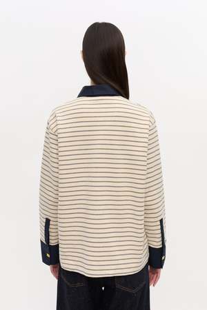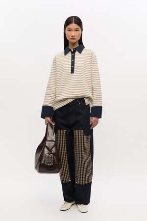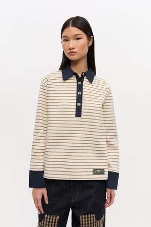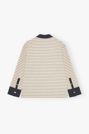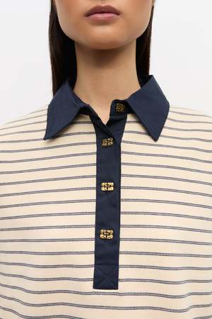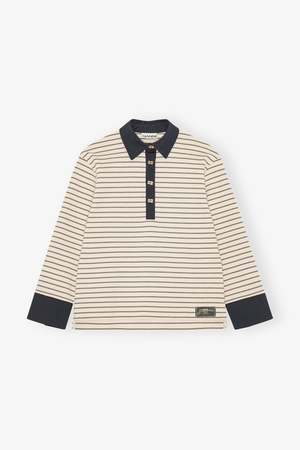 Ganni stripe single piquet jersey polo with long sleeves. Features a navy contrasting collar, gold-tone GANNI Butterfly buttons, and a GANNI logo2 patch at the hem. 100% organic cotton. T4215