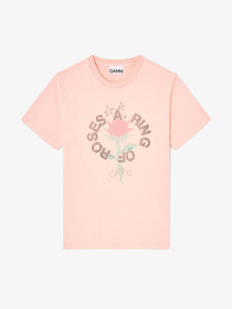 The Ganni T-Shirt brings a playful yet effortless feel to everyday dressing. Crafted in a comfortable regular fit, it features a classic round neckline and a statement Ring a Roses print with a bold oversized flower at the centre. Easy to style with denim, tailoring, or relaxed separates, this tee adds a touch of Gannis signature charm to any casual look. Details - Round neckline - Relaxed regular fit - Straight hems Fabric & Care Composition: 50% Recycled Cotton, 50% Organic Cotton Care: Handwash. Iron on a low heat inside out. Do not dry clean.