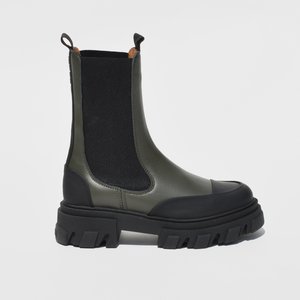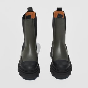 A classic mid-calf style pioneered by Ganni! The Mid Chelsea Boot in kalamata green calf leather and super chunky, ribbed rubber soles and rubber toe caps. Danish fashion house, Ganni, is known for its visual mesh of playfulness and modern concept design. The creators and husband-and-wife duo, Ditte Reffstrup and Nicolaj Reffstrup, launched the brand in 2000 in an attempt to develop products that evoked the Scandinavian aesthetic they felt was missing from the market. Now worn among the fashion community alike, Ganni is expanding into a fruitful powerhouse (and mindfully incorporating sustainability into their practices along the way). DETAILS - Fits on the smaller size, if uncertain please size up - Made in Portugal MEASUREMENTS - Boot Length: 7.5in/19cm - Heel Height: 2in / 5cm - Measurements taken from a size 37