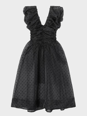 The Black Organza Ruched Dress by Ganni is crafted from lightweight sheer organza with a timeless polka-dot pattern, combining romantic volume with modern structure. It features a flattering V-neckline, softly gathered ruching through the body, and dramatic puff sleeves that add definition to the shoulders. A concealed zip closure ensures a smooth fit, while the wide hem detail creates fluid movement and a refined finish. Pair with sleek black heels and a structured clutch for evening occasions, or style with ankle boots and a leather jacket for a contemporary edge. Model is 511 and wears a size UK 8. Details - Midi organza dress - V-neckline - Puff sleeves - Ruched bodice - Zipper closure - Wide hem detail Fabric & Care - Shell: 100% Recycled Polyester - Lining: 96% Viscose, 4% Elastane Care: Can be gently dry cleaned using perchloroethylene only.