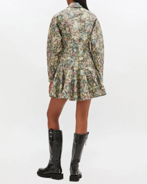 This dress features a tapestry floral print with a classic collar, button-front closure, drop waist, ruffled hem detail, and long sleeves. 97% organic cotton, 3% elastane. Made in India.