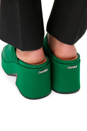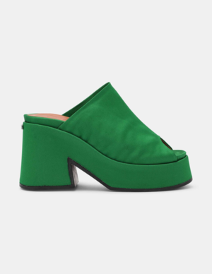 THESE CHUNKY RETRO MULES ARE CONSTRUCTED WITH RECYCLED POLYESTER, AND FEATURE A WIDE-BAND UPPER AND PEEP-TOE-INSPIRED CURVED OPEN TOES. - OPEN-TOE MULE SILHOUETTE - 25 IN / 85 MM PLATFORM HEEL - RUBBER SOLE - ROUND TOE - SLIP-ON STYLE - Color: Kelly Green MADE IN PORTUGAL