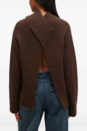This open back pullover sweater from Ganni is a cozy knit made from a soft blend of 50% wool and 50% yak. It features a deep V-neckline, long sleeves with ribbed edges, and a Ganni Butterfly logo2 accent. Oversized fit, take your usual size for a relaxed fit or size down if needed. Model is 5'8 and wears a size XS. Made in China.