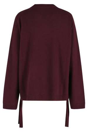Women > Clothing > Sweaters > Sweaters Sweater by Ganni in a burgundy color featuring a crew neck, ribbed edges, contrasting embroidered logo2, wool blend fabric, and side tie details.