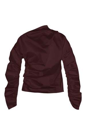 This top features an asymmetrical neckline, ruching at sleeves, and a twisted open back detail. - 74% acetate, 23% recycled nylon, 3% elastane - Asymmetrical neckline - Ruched sleeves - Twisted seam front detail - Twisted open back detail