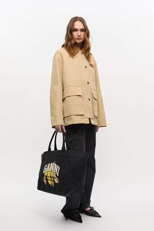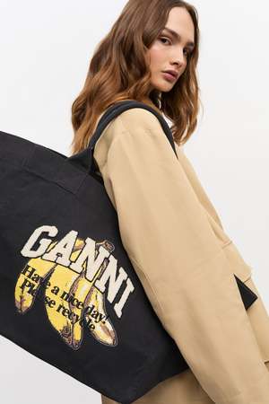 This extra large tote bag by GANNI is crafted from black canvas and features a banana print with a GANNI logo2 and a 'Have a nice day! Please recycle' message. The bag has top handles and one compartment. Made with 100% recycled cotton for both the exterior and lining. Height: 13.4" (34 cm) Width: 25.6" (65 cm) Depth: 8.6" (22 cm) Strap Length: 8.6" (22 cm) Made in India.