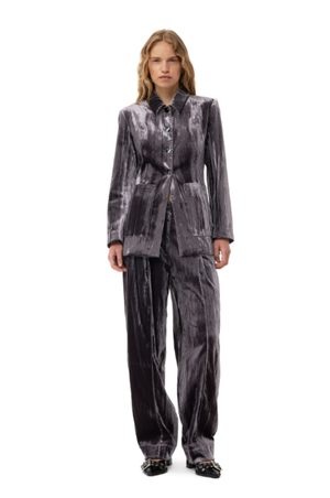 These trousers, crafted from a blend of viscose, polyamide, and elastane, showcase a relaxed fit with vertically crinkled grey velvet. The design includes a hook and bar closure, zip closure, belt loops, side pockets, and a decorative pocket at the back. Viscose 75%, Polyamide 20%, Elastane 5%.