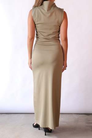 This long sleeveless dress features a softly draped neckline and is crafted from Milano jersey fabric, gently gathered at the neck for a flattering fit. 69% Rayon 29% Polyamide 2% Elastane - Dry clean only - True to size - Imported Model is 5'4" wearing size 34. Model wears a size 0 (XS) in tops and size 24 (0) in bottoms.