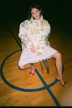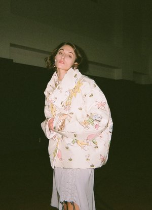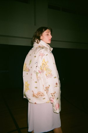 Noemie is wearing the Gobby Bomber Jacket. This piece is cut to create a boxy silhouette. Snap closures and funnel neck collar, with inner and outer pockets. This piece features their take on a classic conversational print, with a scene of sleepy and intoxicated suns, moons, and puppies drawn by artist and musician Gobby Sugrue, forming comforting but distorted figures on the body.