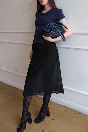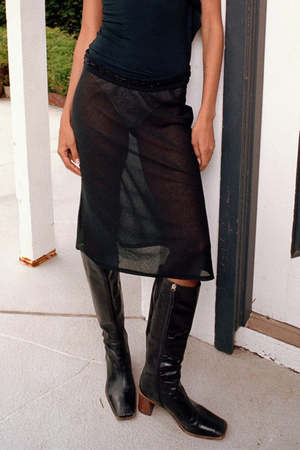 Geel black sheer Brynn midi length bias slip skirt with an elastic waistband. 73% supima cotton, 27% nylon.