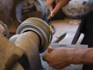 Multicolor Heishi Bracelet by Gerard & Mary Calabaza Black: Jet - Pennsylvania White: Melon Seashell - West Coast Blue-Green: Turquoise - Kingman, AZ Red / Light Red: Apple Coral - Mediterranean Sea 8 inches long Each Stone is Cut and Ground by Hand Sterling Silver Clasp Copper Disc Stamped with Artist's Initials "GC" or "LC" Santo Domingo Pueblo Made Made in USA - Renowned jewelers from the Pueblo of Santo Domingo - Husband and wife duo known for handcrafting exquisite heishi jewelry - Traditional heishi, contemporary, and statement pieces - Best of Division Necklace at SWAIA 2017 - 1st Place Necklaces at SWAIA 2017 - 2nd Place Coordinated Sets at SWAIA 2017 Mary and Gerard Calabaza, jewelers from Santo Domingo Pueblo, are a husband and wife duo known for handcrafting exquisite heishi beads and creating beautiful statement necklaces in traditional and contemporary styles. Each piece they create is a unique work of art. Gerard learned the art of making heishi necklaces from his parents, Pula and Delphanita Calabaza, at the age of 13. Mary learned jewelry - and pottery-making from her parents, as well, at the age of 12. She credits her mother for teaching her how to drill, grind and slice stones. Mary married into the Calabaza family and joined her husband in the family legacy of making highly quality heishi necklace and jewelry.