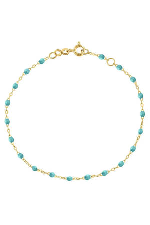 This simple classic gigi bracelet in turquoise handmade in the south of France and has a length of 6.7 inches, adjustable to 6.4 inches. It's an easy fit wherever you go, worn as a single strand or layered. The classic gigi collectsion is a celebration of life, color, and you. TURQUOISE GREEN + 18K YELLOW GOLD