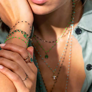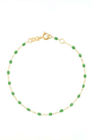 This classic gigi bracelet in emerald green is handmade in the south of France. It has a length of 6.7 inches, adjustable to 6.4 inches. Can be worn as a single strand or layered. Materials: Green beads and 18K yellow gold.
