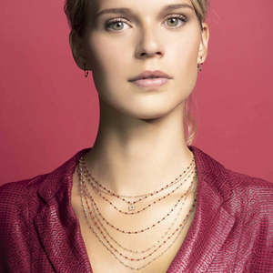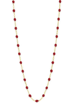 The Classic Gigi Necklace by Gigi Clozeau is designed to celebrate the birth of Alain Clozeau's daughter, embodying spontaneity and hope. Handmade in the south of France, this necklace measures 16.5 inches and is adjustable to 15.75 inches. It can be worn as a single strand or layered. Materials: 18K yellow gold and cherry resin beads.