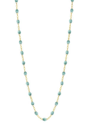 Designed by Alain Clozeau to celebrate the birth of his daughter, the classic gigi embodies all the spontaneity and hope that life has to offer. Handmade in the south of France, this necklace is 16.5 inches, adjustable to 15.75 inches. It can be worn as a single strand or layered. Materials: 18K yellow gold and resin beads (Iceberg).