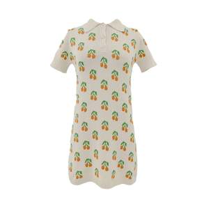 A light cotton polo dress in natural, dotted with orange cherries and green leaves. Classic in silhouette, joyful and charming in spirit, an easy piece made to brighten everyday moments. Knit with 100% organic cotton. Fits true to size. To care for your Gigi knitwear in cotton, machine wash with matching colors and air dry, or dry clean.