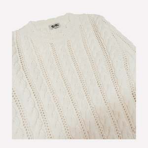 Romantic ivory cable knit sweater brings softness and femininity for cooler days. Crafted with chunky cables and delicate eyelet details, its finished with scalloped ribbed edges. Thrown over a slip dress, or layered with denim its a standout piece that still feels effortlessly wearable. Details Knit with 100% Fine Merino wool Mother of pearl flower shaped buttons Fit: True to size, not oversized To care for your Gigi knitwear, hand wash in cool water and lay flat to dry or dry clean.