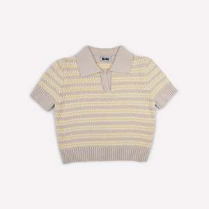 The Stripe Polo Top in Natural features tonal light yellow and white stripes with a matching natural ribbed collar and hem. This short-sleeve polo is crafted from 100% organic cotton for a breathable, comfortable fitperfect for effortless summer style. Details: - Knit with 100% Organic Cotton - Collar - Lucie is wearing size Small To care for your Gigi knitwear in cotton, machine wash with matching colors and air dry or dry clean.