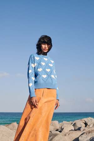 The Love Sweater by Gigi Knitwear features a sky blue color with ivory intarsia hearts nestled in diamonds, shaped with knitted eyelets. This soft and breathable medium weight knit sweater has a relaxed fit with a boxy and slightly cropped shape. It includes a ribbed collar, hem, and cuffs. Knit with 100% Fine Merino Wool. Fit: Eli is a size 2 and wears a size Small.