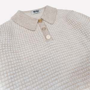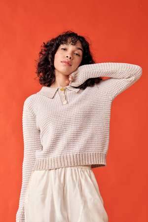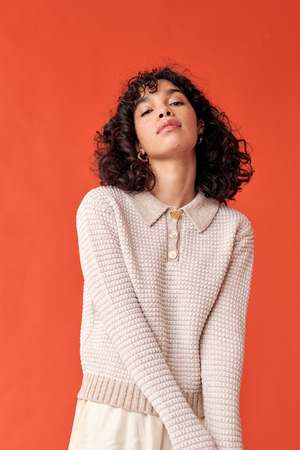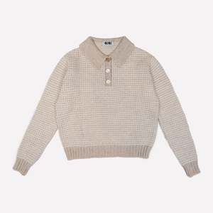 The Mismatch Polo Sweater features an easy fit that balances slouchy and slim, perfect for layering or wearing solo. Crafted from soft 100% fine merino wool, shades of beige marl and ivory are seamlessly knit together to create a striped effect. The sweater is finished with a ribbed elongated collar, hem, cuffs, and a knit placket with three mismatched vintage buttons. Details: - Available in Beige Marl and Ivory Stripes - Knit with 100% Fine Merino Wool - Ribbed elongated collar, hem and cuffs - Knit placket with 3 mismatched vintage buttons - Lisa wears a size Small