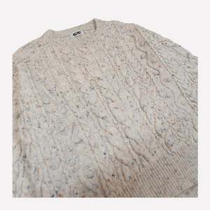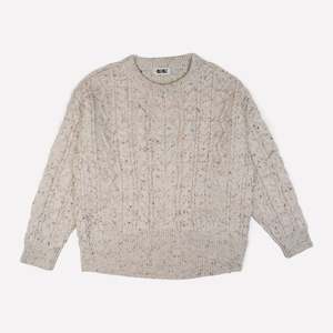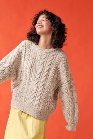 The Oversized Cable Sweater by GiGi Knitwear features a soft, breathable merino yarn, lending itself to a slouchy, easy shape. Outsized cables of various shapes, sizes, and textures are knit together to create unique surface detailing and dimension. This generous fitting sweater is perfect for fall and winter layeringwear it casually or with wide-leg trousers to bundle up on chilly days. The natural hue is peppered with multicolored speckles throughout. Details: - Available in Natural Speckle - Knit with 100% Fine Merino Wool - Ribbed crew neck collar, hem, and cuffs - Oversized fit - Model Lisa wears a size Medium