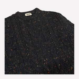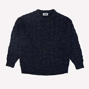 The Oversized Cable Sweater features a soft merino yarn that is breathable, lending itself to slouchy, easy shapes. Outsized cables of various shapes, sizes, and textures are knit together to create surface detailing and dimension. Perfect for fall and winter layering, this generous fitting sweater can be worn casually or with wide-leg trousers to bundle up on chilly days. Available in Navy Speckle. Knit with 100% Fine Merino Wool. Ribbed crew neck collar, hem, and cuffs.