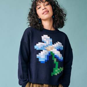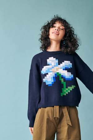 The Pixel Flower Sweater features a multicolored daisy pattern knitted into a navy fine Merino wool base. This relaxed silhouette offers an update on the classic drop shoulder shape with a slightly boxy fit. Details include a ribbed crew neck collar, hem, and cuffs. Knit with 100% Fine Merino Wool. Lisa wears a size Small.