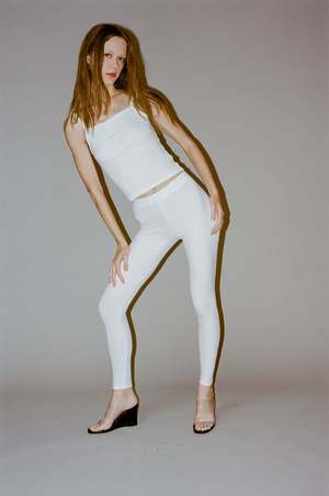 Gil Rodriguez Benton Legging in White - Full length leggings featuring a super high waist and a wide, flattering elastic waistband. Made in USA from locally sourced, high-end cotton spandex jersey thats lightly sanded for a subtle velvety hand feel. - 90% Cotton 10% Spandex. - Fabric is forgiving. When in doubt, size down.
