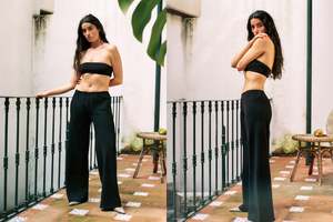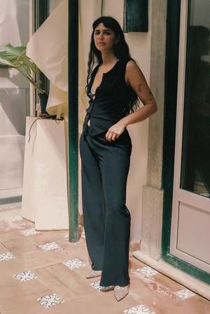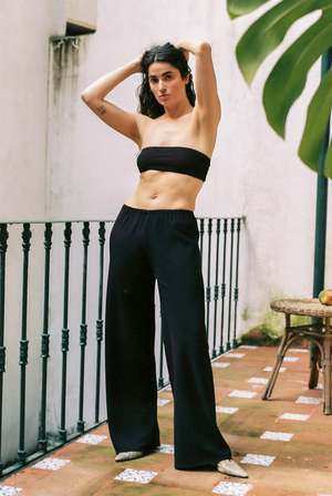 A mid-rise bias-cut pant with a narrow elastic waistband and wide leg. Made in USA from a Japanese double-faced satin, which has a lovely weight and drapes beautifully. 100% Polyester. Model wears size S.