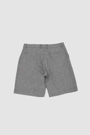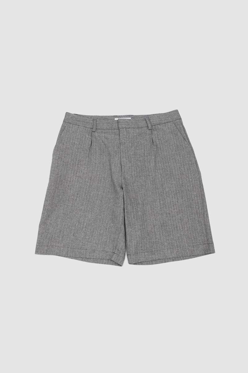 Grey and beige herringbone midi shorts with a mid-rise fit and tailored cut.