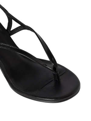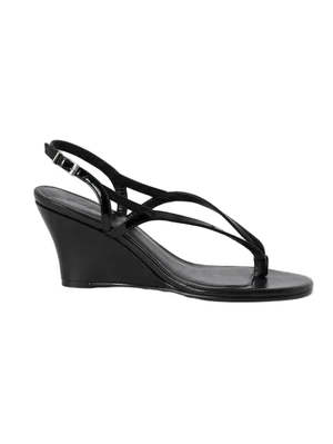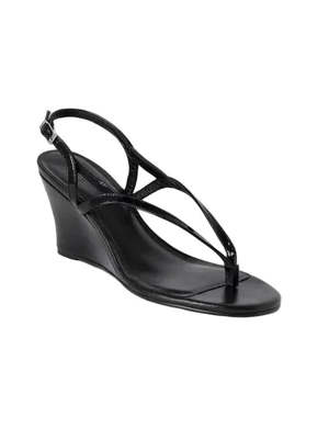 Black patent leather wedge sandals with a glossy finish. - Slim straps around toes and ankle - 7.5 cm wedge heel - Open toe design - Made in Spain - 100% leather
