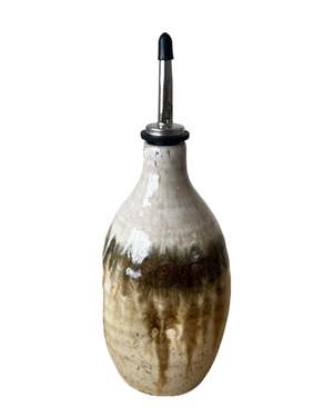 Add a touch of elegance to your kitchen with the Borealis Ceramic Oil Cruet from Gina de Santis Ceramics. This hand-thrown cruet features three thumbprint indentations for easy grip and a narrow neck spout for drip-free pouring. It stands 8 inches tall (10.5 inches with the spout) and holds approximately 22 ounces of oil or vinegar. Available in two colorways: Dusk (bright pink tones) and Dawn (neutral mix with subtle pink). Each piece is handmade and unique; variations in glaze and form are to be expected.