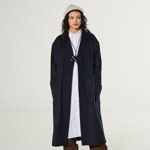 All style, all comfort. This oversized loose collarless coat is the perfect extra layer over a lighter jacket or sweater, offering both warmth and a touch of class. Made in Portugal from a premium Italian wool blend fabric, finished with 2 large front pockets and corozo buttons. Fully lined as well. - G.o.D. Pinstripe Overcoat in Navy Blue - Oversized fit - 80% wool, 20% polyester - Made in Portugal The model is 172 cm tall and wears size small. Size 1 = fits xsmall to medium Size 2 = fits medium to extra large
