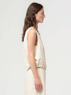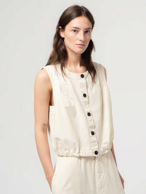 The Girls of Dust Veston is a cropped vest made from a soft cotton linen blend. Its clean lines and structured fabric create a versatile piece that layers easily or can be worn as a standalone piece. - Sleeveless cropped top - Corozo button closure - Elasticated waist - 88% cotton, 12% linen - Made in Portugal - Isa is 178 cm tall and wears size Small