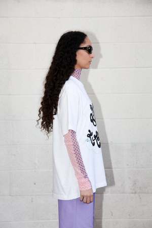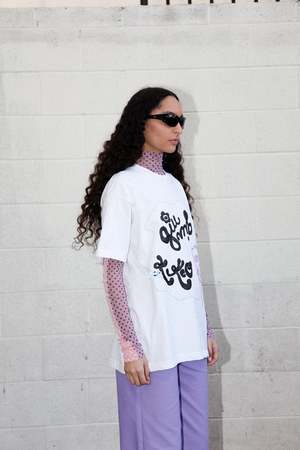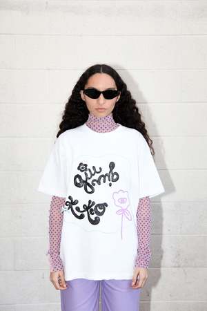We partnered back up with our friends at Giu Giu to bring you a KkCo our 'Grand Opening' Tee - 100% cotton jersey - Made in Los Angeles - Glittered screen print Size & Fit - Model is 5'7" and wears size S/M - Oversized fit