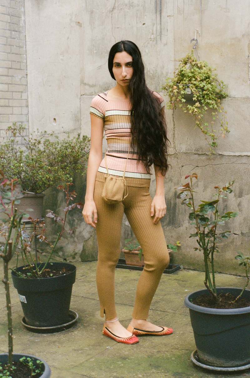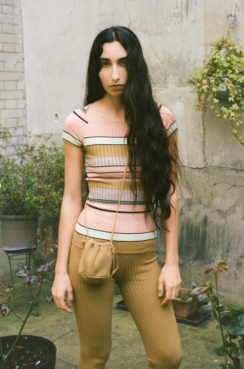 The Nonna Florentine Tee has the same classic fit as the Nonna Tee with a flattering Florentine neckline. It features horizontal stripes in shades of peach and brown and a deep rib knit that comfortably conforms to the body. This piece will mold to your form and stretch to fit your shape while smoothing over lines. Maryam is 5'6 and a size extra small, and wears size small. Material: Cotton / Lycra. Dry clean or hand wash cold and lay flat to dry.