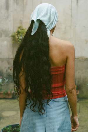 Ribbed knit triangle head scarf in icy blue, accented by a soft sage green border. This head scarf can also be draped around the shoulders or hips to add visual interest to any outfit. Bandana expands to fit, but measures 35" wide and 14" deep when laid flat. Material: Cotton / Lycra. Dry clean or hand wash cold and lay flat to dry.