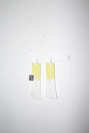 Classic 5-Finger Reflexology Sock in ribbed knit. 2-tone with a clear non-slip "GIU GIU" grip on the bottom. knitted with Cotton / Silk yarn in Nara, Japan A cotton canvas drawstring carrying bag, with a map to locate pressure points on the feet in included with your purchase. *One Size*