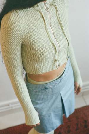 Shrunken ribbed cropped hoodie with an O-ring zip front. Features a deep rib that comfortably conforms to your body. This piece molds to your form and stretches to fit your shape while hugging you closely. Drawstring hood to adjust the fit as desired. Long sleeves with a thumb hole at each cuff. Maryam is 5'6" and a size extra small, and wears size small with the Nonna Pants X-Long in Eggshell Micro Cable and Mini Skirt in Blue/Grey/White Check. Material: Cotton / Lycra. Dry clean or hand wash cold and lay flat to dry.