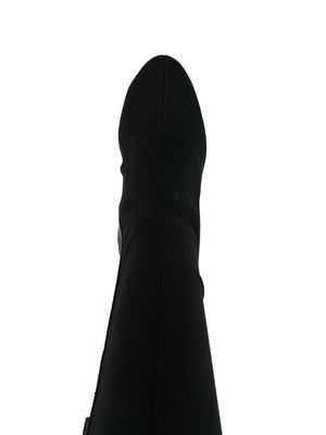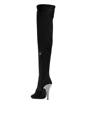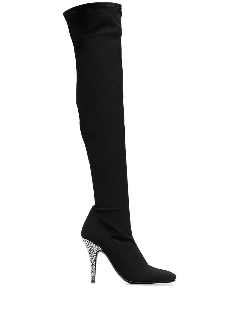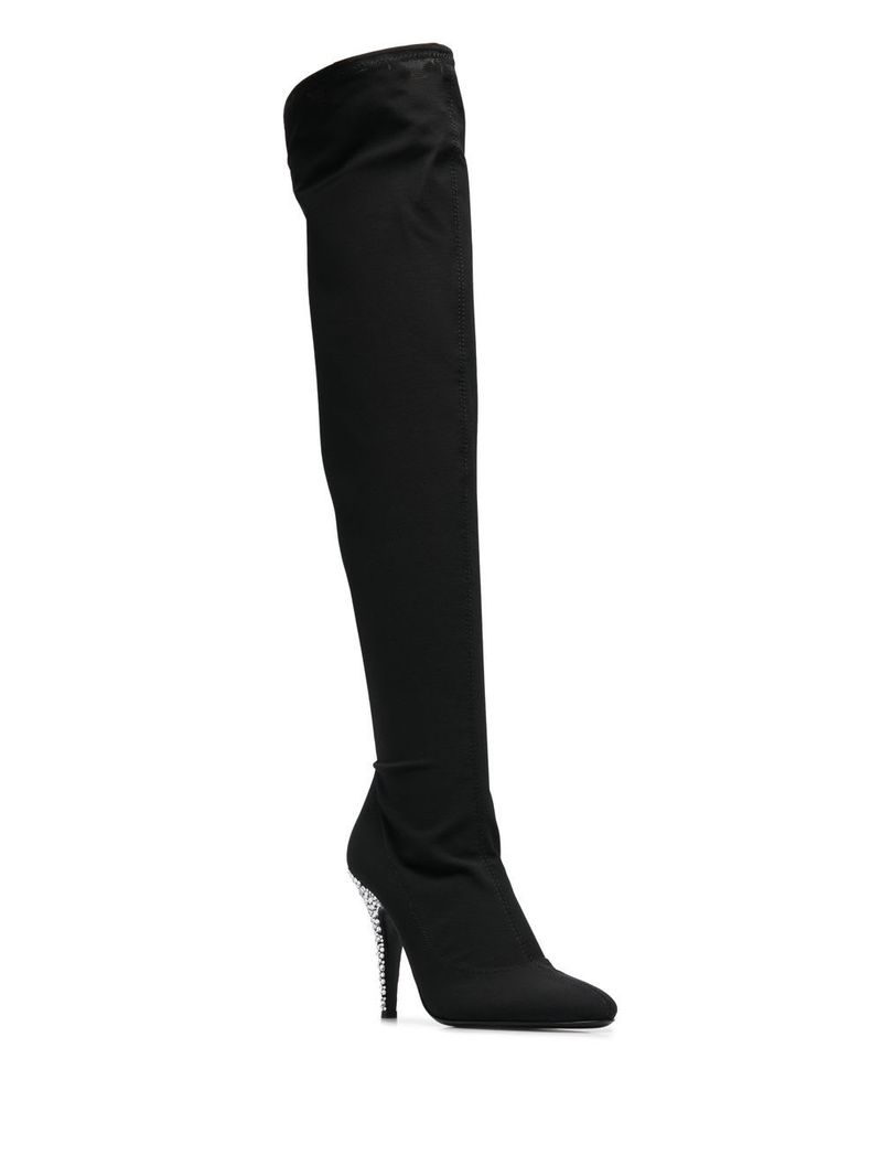 Women > Shoes > Boots Calixtee Cuissarde 110mm thigh-high boots from Giuseppe Zanotti featuring black calf leather, rhinestone embellishment, pointed toe, side zip fastening, branded insole, and a high heel. Composition: Outer: Calf Leather, 100% Fabric: 100% Sole: Calf Leather, 100% Lining: Fabric, 100%